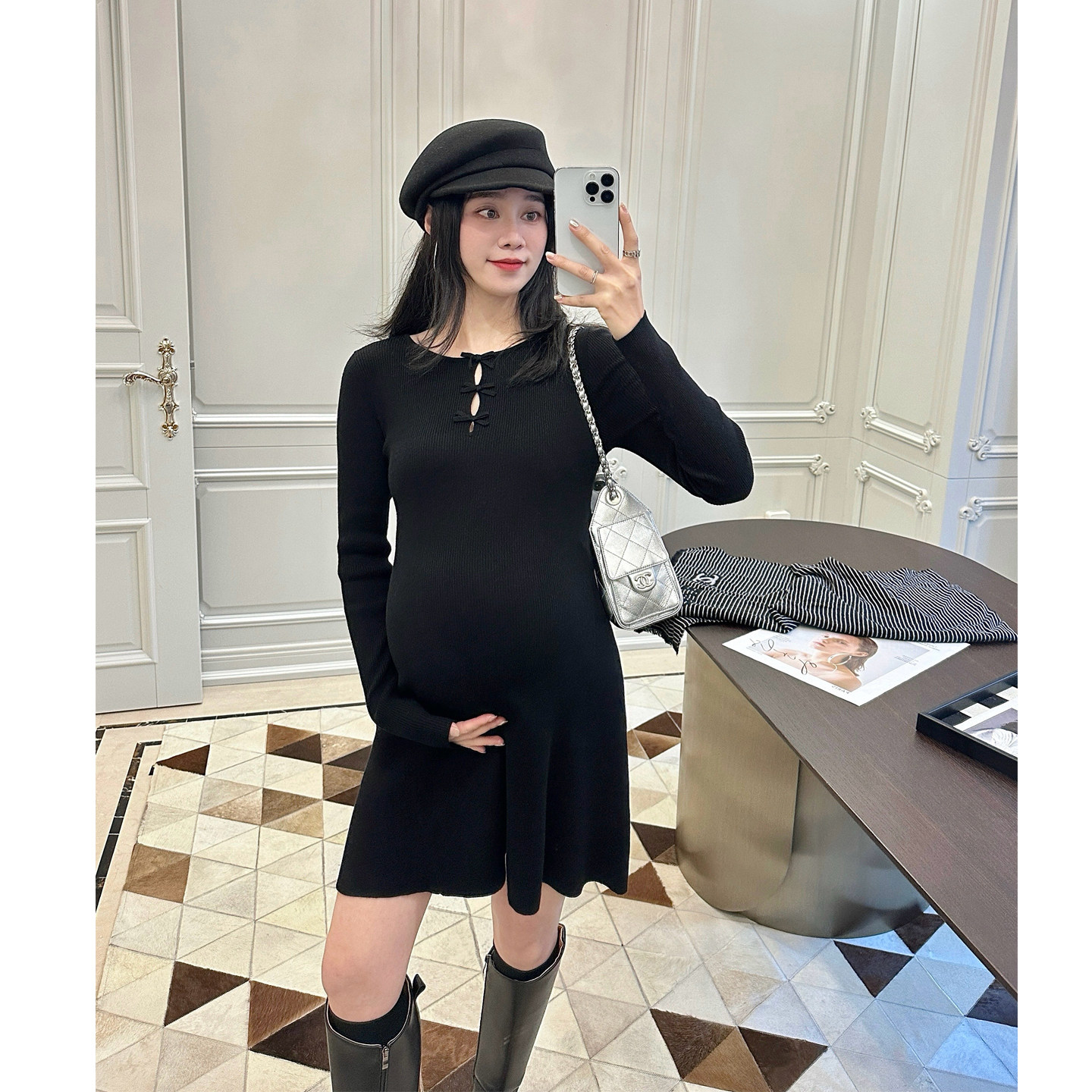 LeoMami孕妇装春秋款蝴蝶结羊毛针织连衣裙修身显瘦打底A字小黑裙