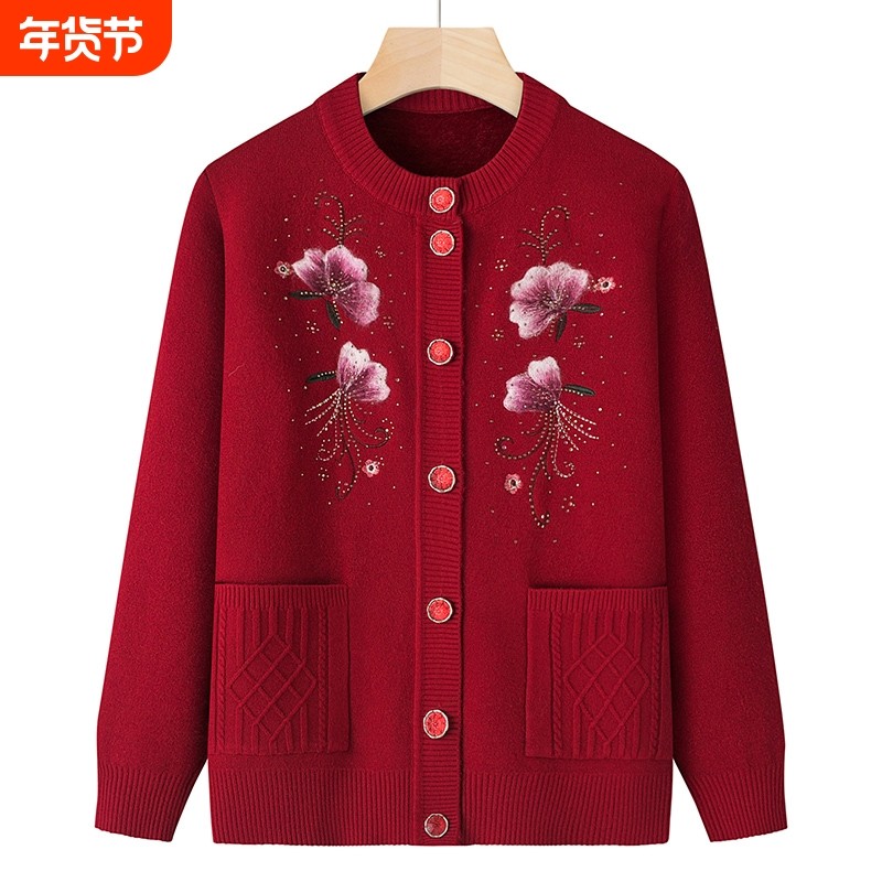 中老年人女秋冬加厚羊毛衫本命年红色妈妈装针织羊绒开衫毛衣外套