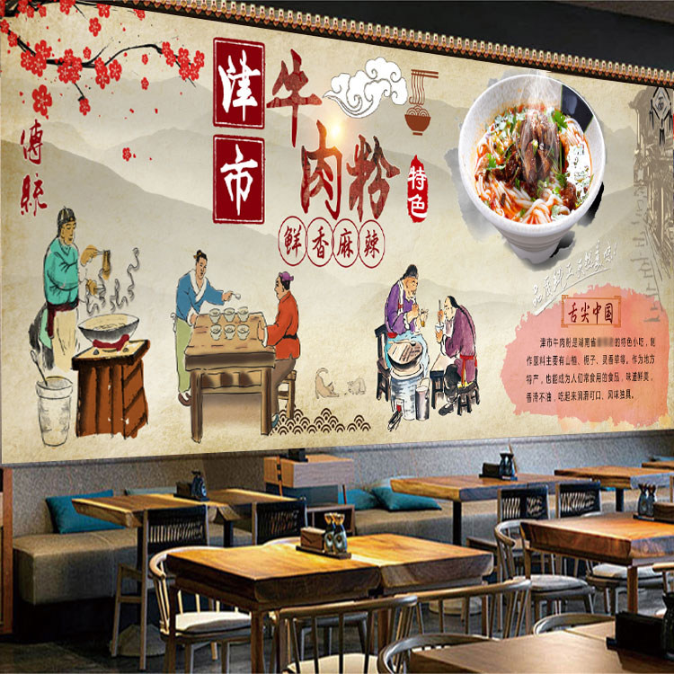 传统津市牛肉粉背景墙布壁画壁布湖南特色汤粉店面馆装饰墙纸壁纸