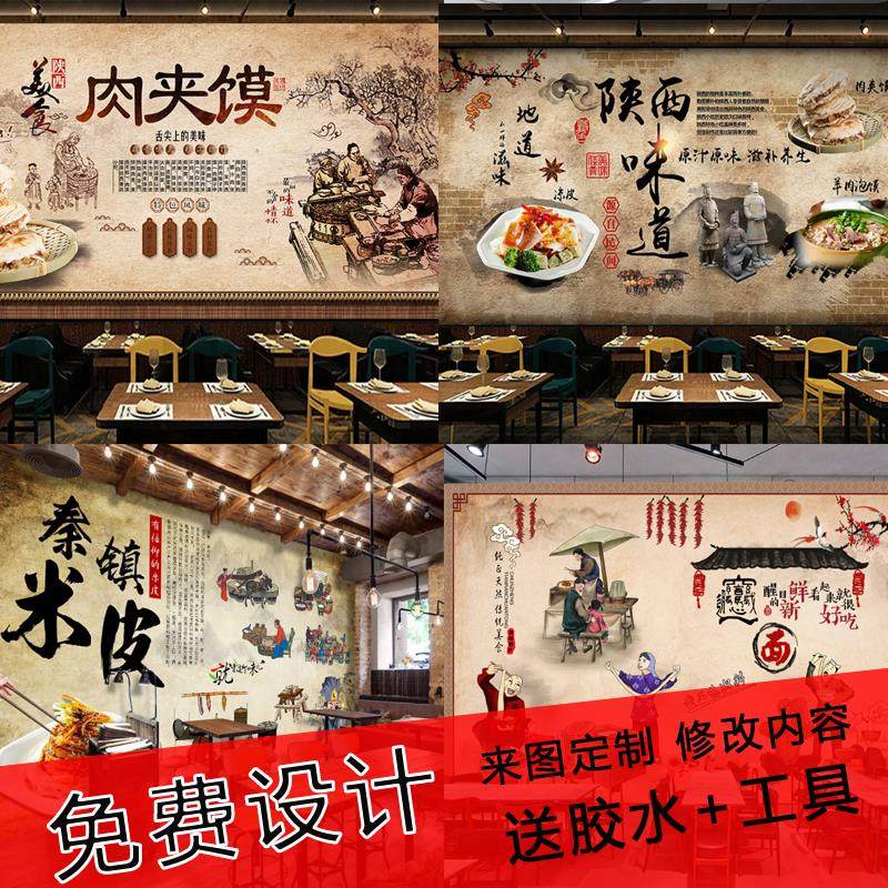 陕西八大怪背景墙壁画臊子面米皮凉皮壁布墙布面馆肉夹馍墙纸壁纸