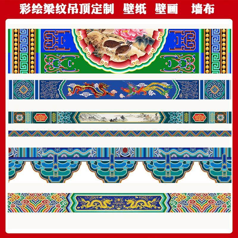 古典建筑房梁吊顶天花墙纸壁纸壁画壁布寺庙皇宫佛堂彩绘花纹墙布