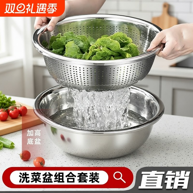 三四钢®304不锈钢盆316食品级加厚汤碗家用洗菜盆沥水篮套装汤盆