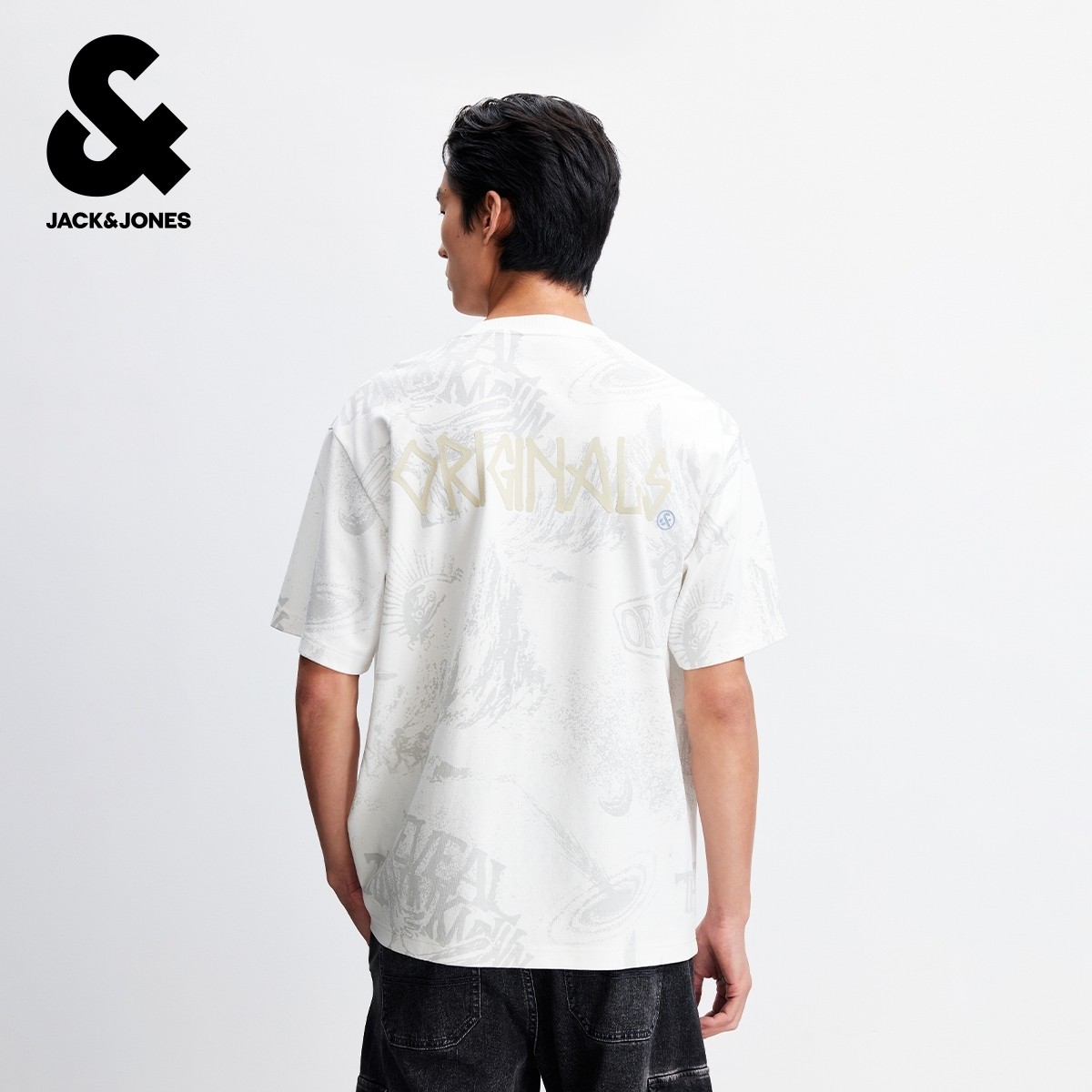 杰克琼斯男生2025年冬款T恤圆领衣身满印短袖休闲百搭日常上衣