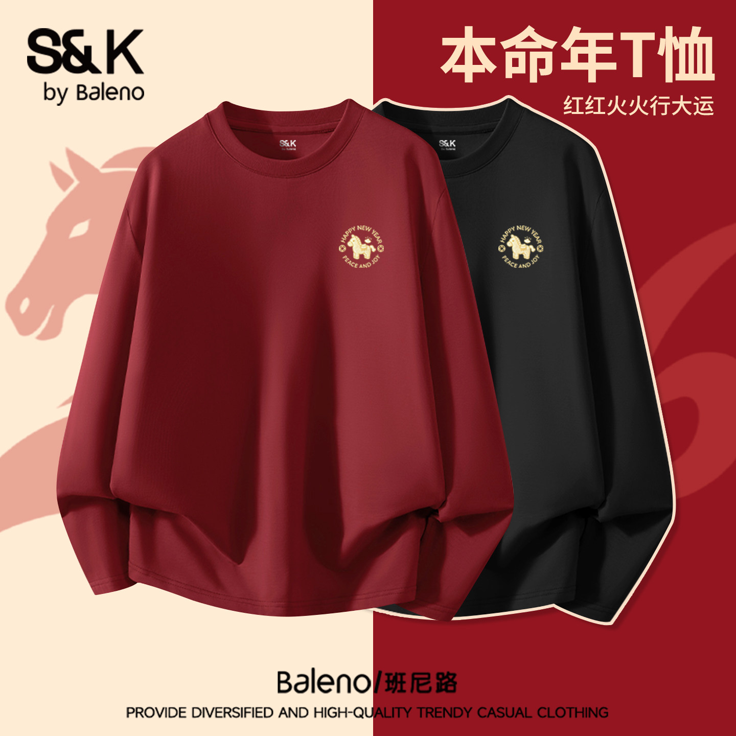 班尼路S&K系列本命年男士打底衫秋冬款纯棉长袖男款内搭红色T恤LF