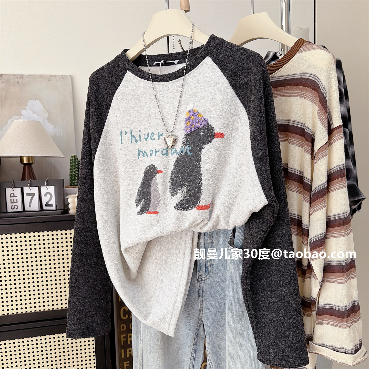 韩代款~毛巾暖绒宽松大码上衣企鹅图案洋气简约百搭加厚冬款T恤潮