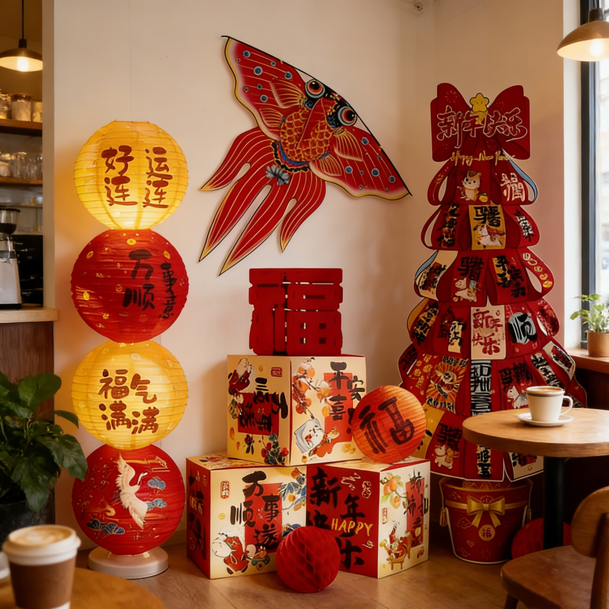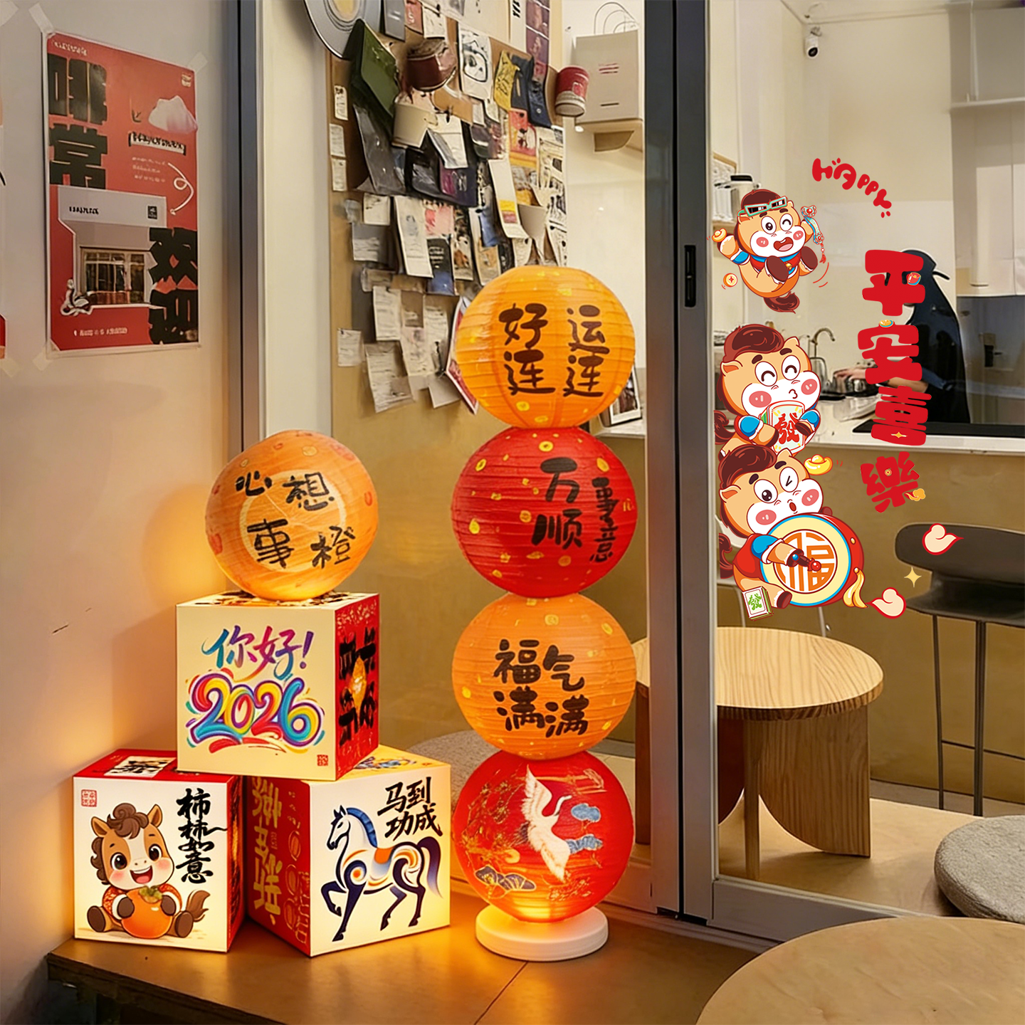 2026元旦装饰灯笼立柱新年店铺橱窗门口新年氛围场景布置堆头盒子