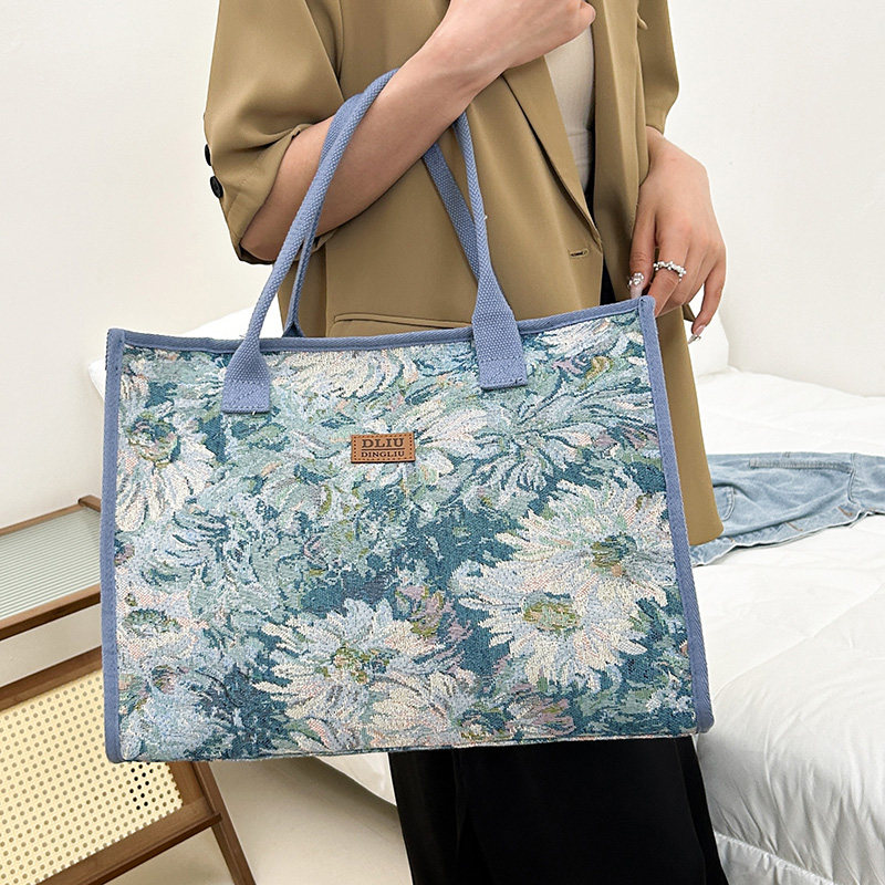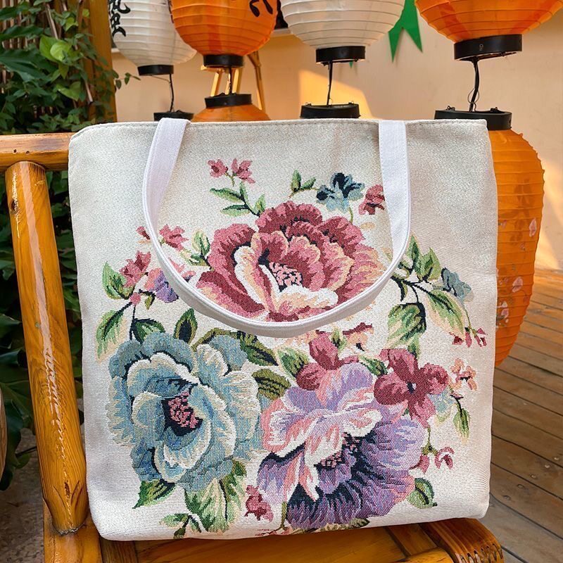 新款双面提花刺绣帆布包手提包休闲文艺瓶中花单肩包购物包妈咪包