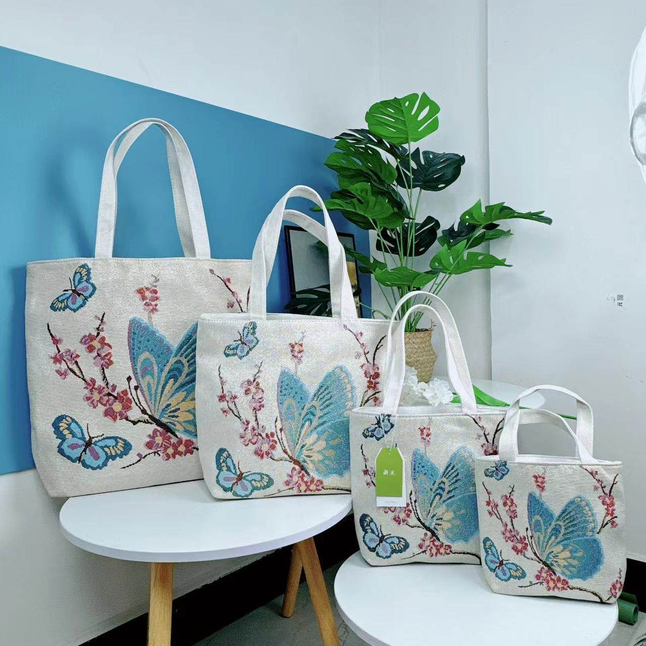 蝴蝶双面刺绣帆布包手提包手拎外出百搭休闲手拎单肩包时尚通勤包