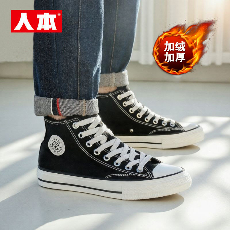 人本加绒高帮帆布鞋女2025秋冬学生平底休闲板鞋黑色韩版保暖棉鞋