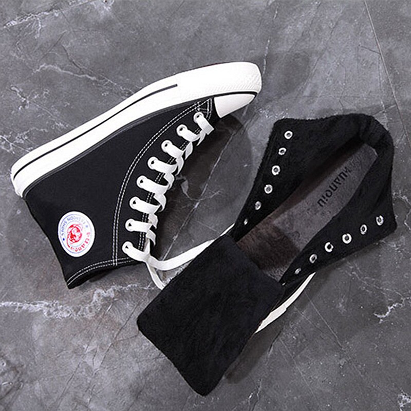 人本加绒高帮帆布鞋女秋冬保暖韩版百搭学生板鞋黑色系带平底棉鞋