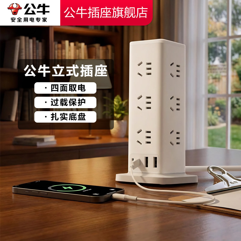 公牛立式插座插排多功能塔式拓展USB家用办公桌排插多孔位插线板