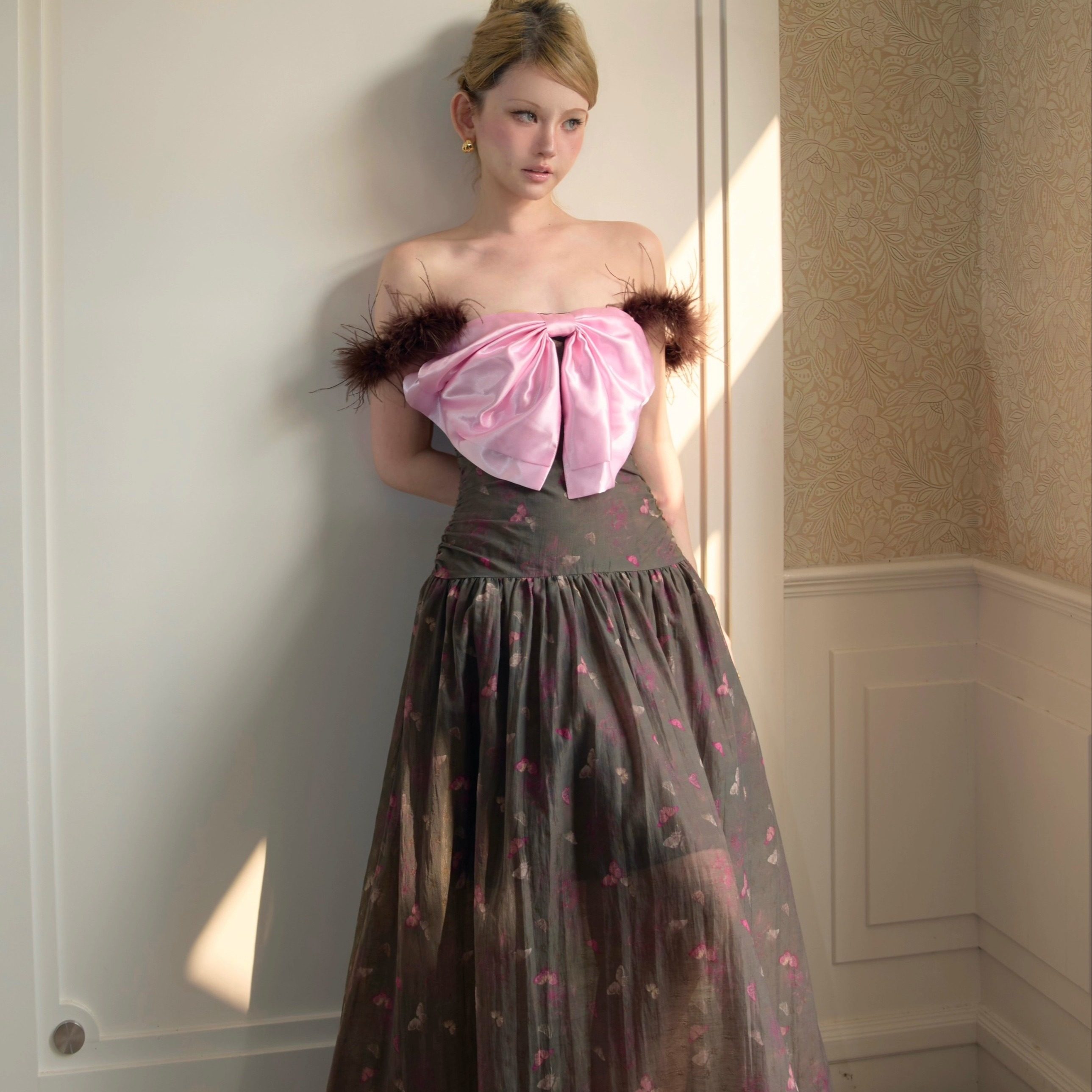 HELERUN 法式千金雪纺蝴蝶印花连衣裙毛毛袖子礼服蝴蝶结收腰长裙