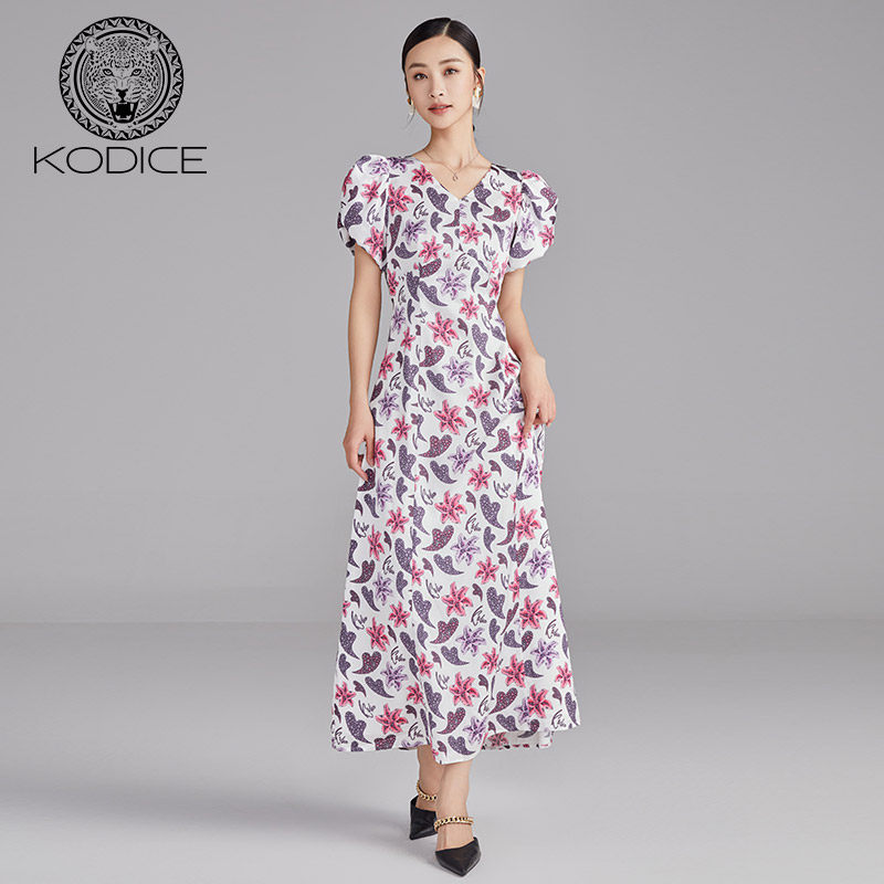 KODICE印花雪纺长裙女装夏季新款长款V领泡泡袖收腰度假连衣裙子
