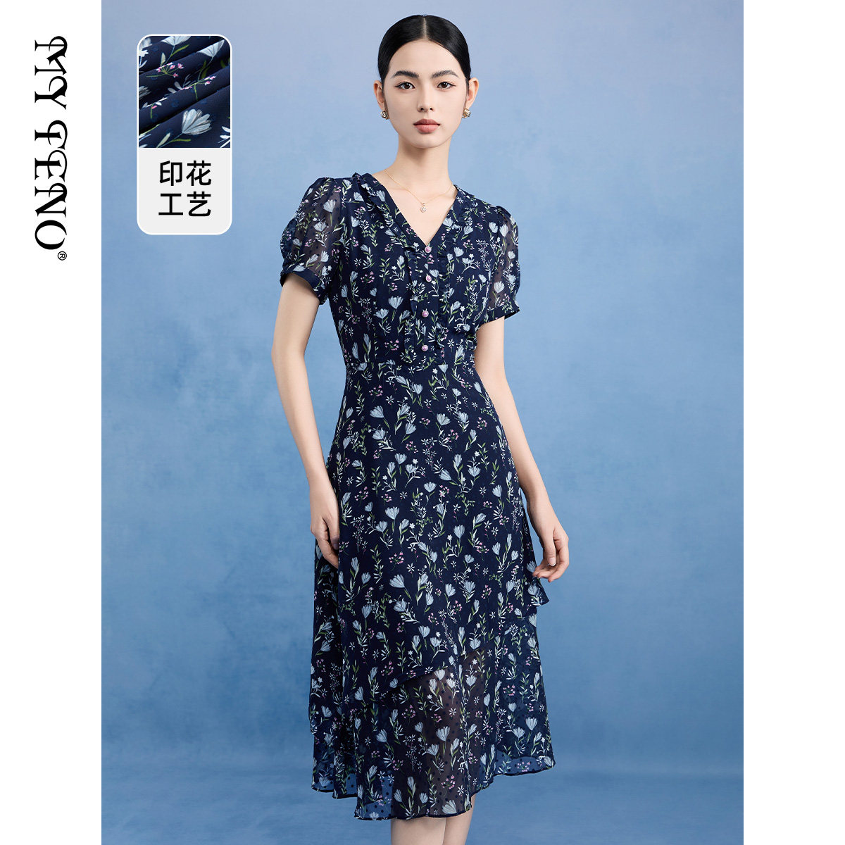 XINYI【暗夜玫瑰】夏季雪纺印花V领连衣裙收腰显瘦气质X625Q09957