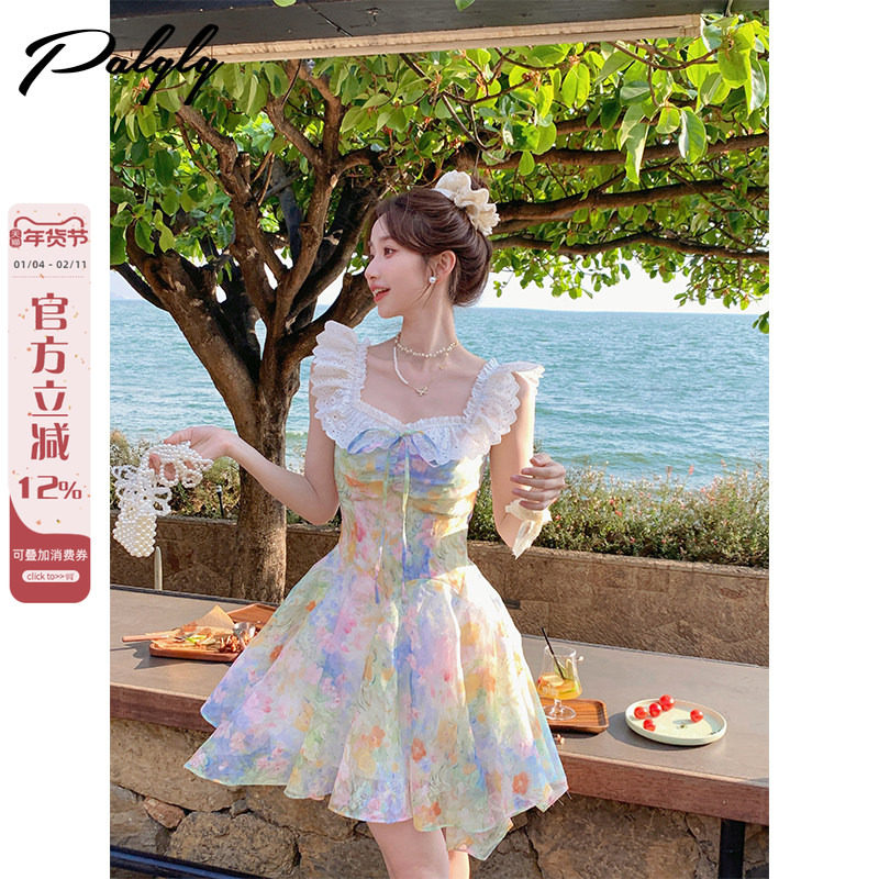 衣纱布菲仙眉 超仙森系甜美雪纺连衣裙夏天收腰荷叶边印花裙子女