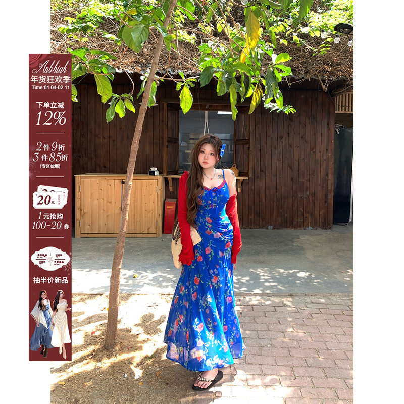 安妮不火 蓝礁红槿印花v领鱼尾雪纺吊带裙微胖大码收腰碎花连衣裙