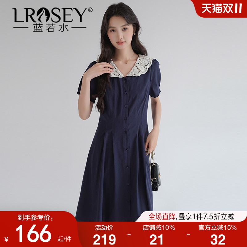 【复古蕾丝娃娃领连衣裙】蓝若水大码2025夏装新款气质收腰A字裙