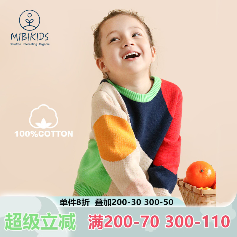 mibi儿童毛衣秋冬新款男童毛衫纯棉拼色女童洋气韩版圆领针织衫