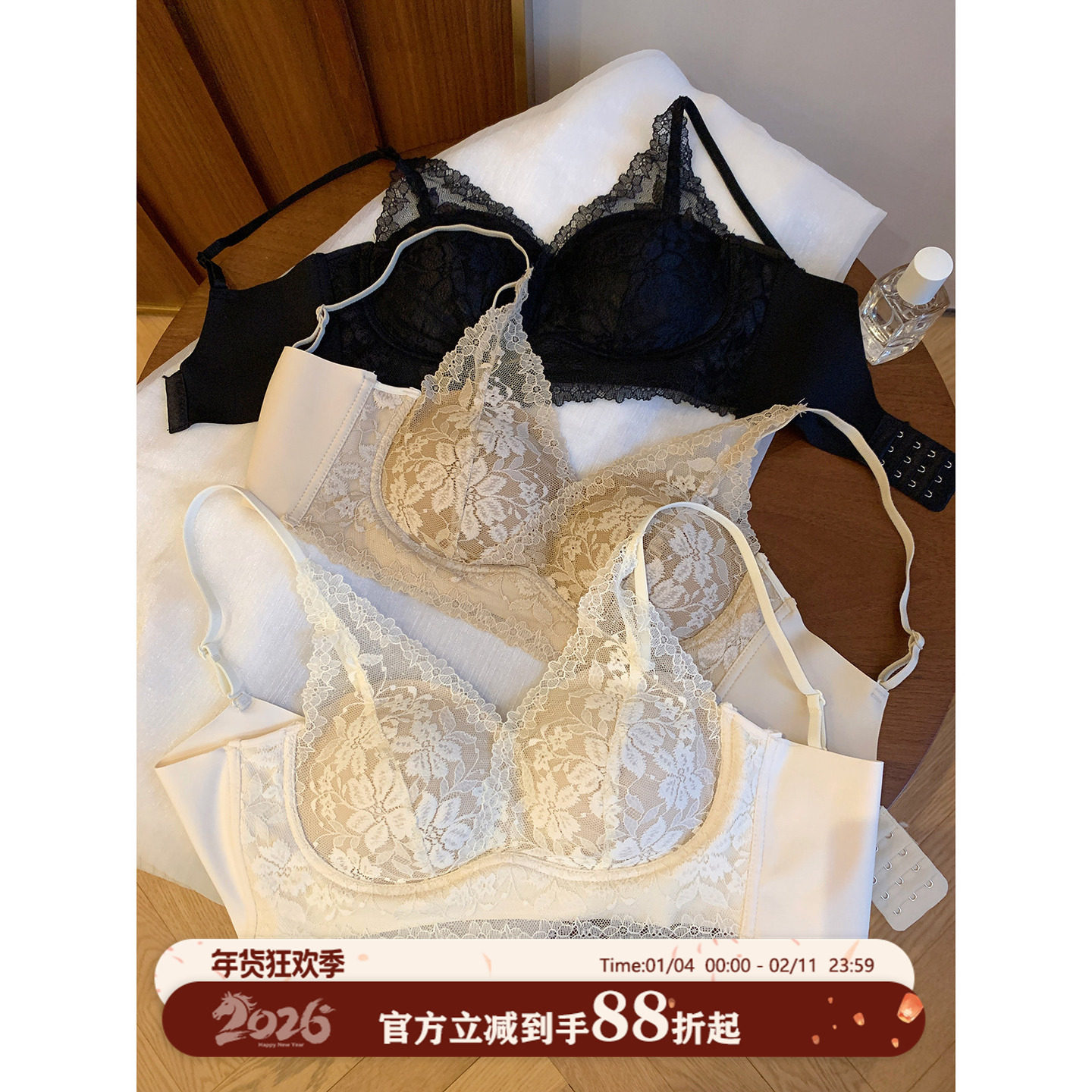 雅小姐法式蕾丝内衣女大胸显小秋冬薄款透气软钢圈性感聚拢文胸女