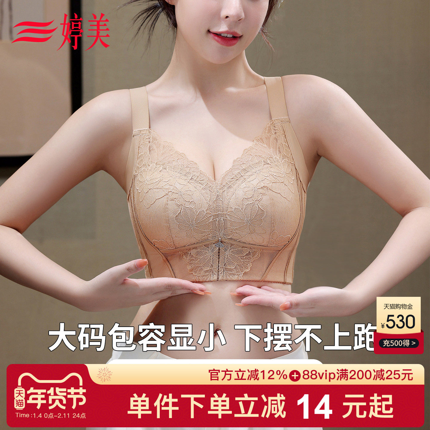 婷美秋冬大胸显小全包容蕾丝内衣调整型收副乳提拉防垂大码文胸罩