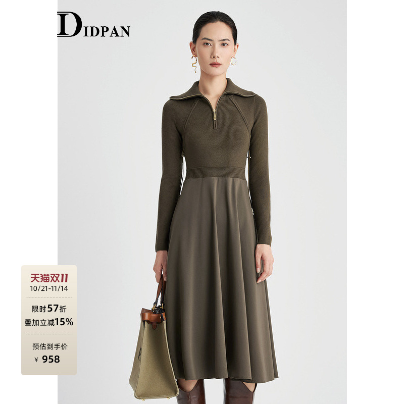 IDPAN针织长袖连衣裙冬新款精致通勤收腰显瘦设计感女士裙子