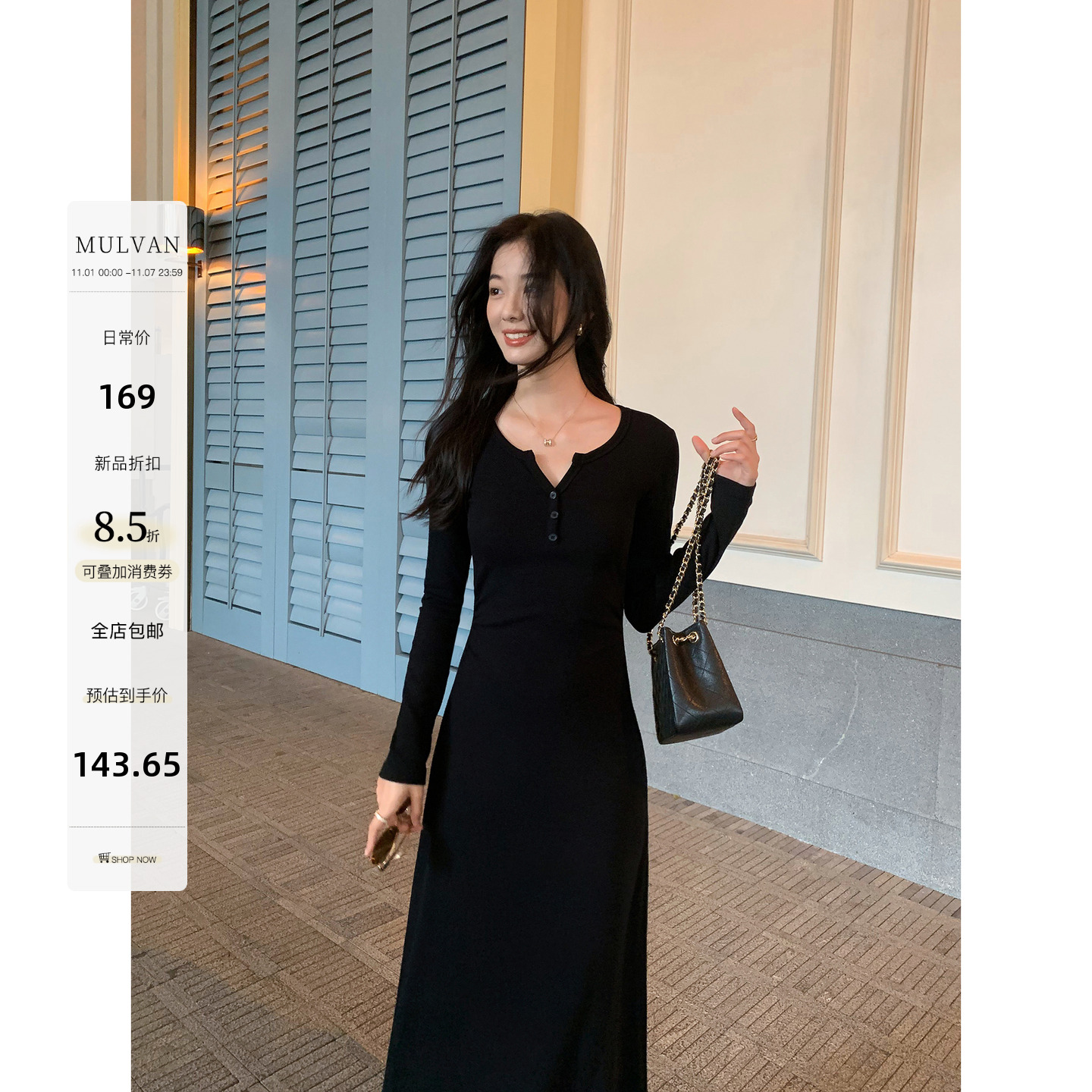 MULVAN 高级感黑色长袖针织连衣裙女秋季收腰显瘦气质打底长裙子
