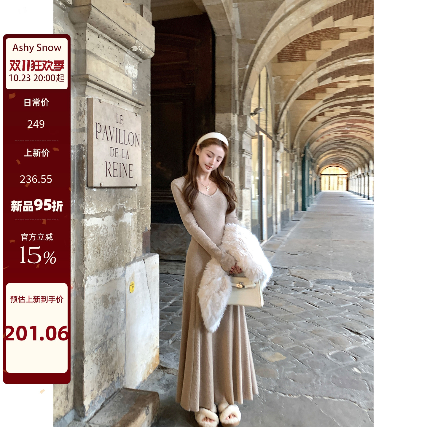 灰尘邓邓 V领针织连衣裙女2025早秋法式收腰长裙包臀裙长袖裙子