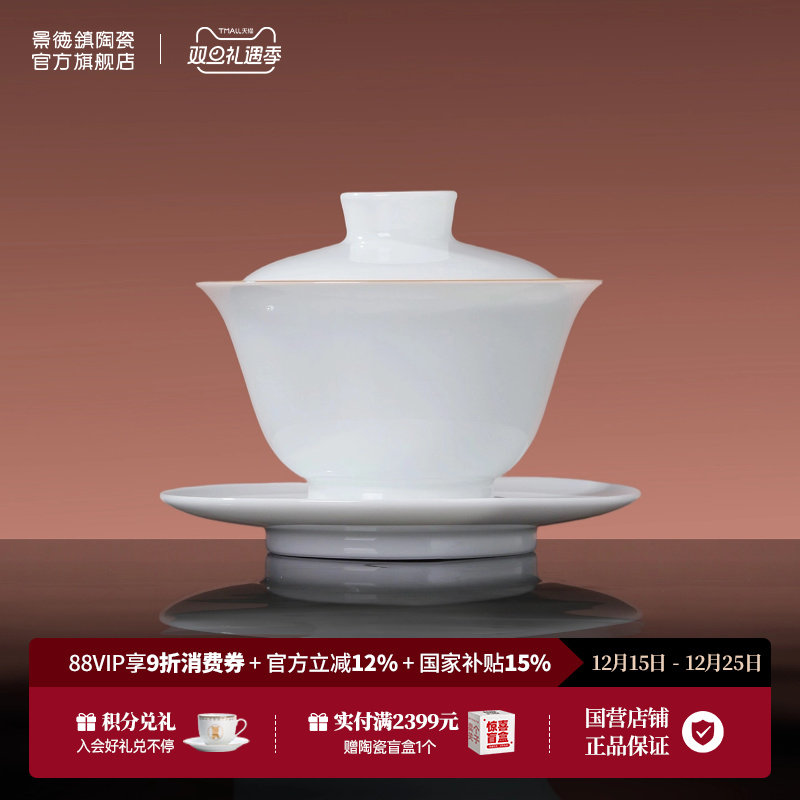 景德镇官方陶瓷中国色三才盖碗家用整套茶具纯白浮雕高档送礼茶碗