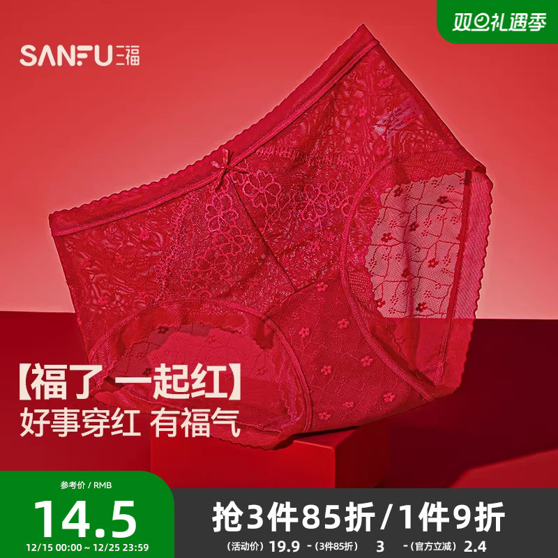 三福中腰包臀内裤女本命年红色内裤蕾丝拼接透气半平角裤505965