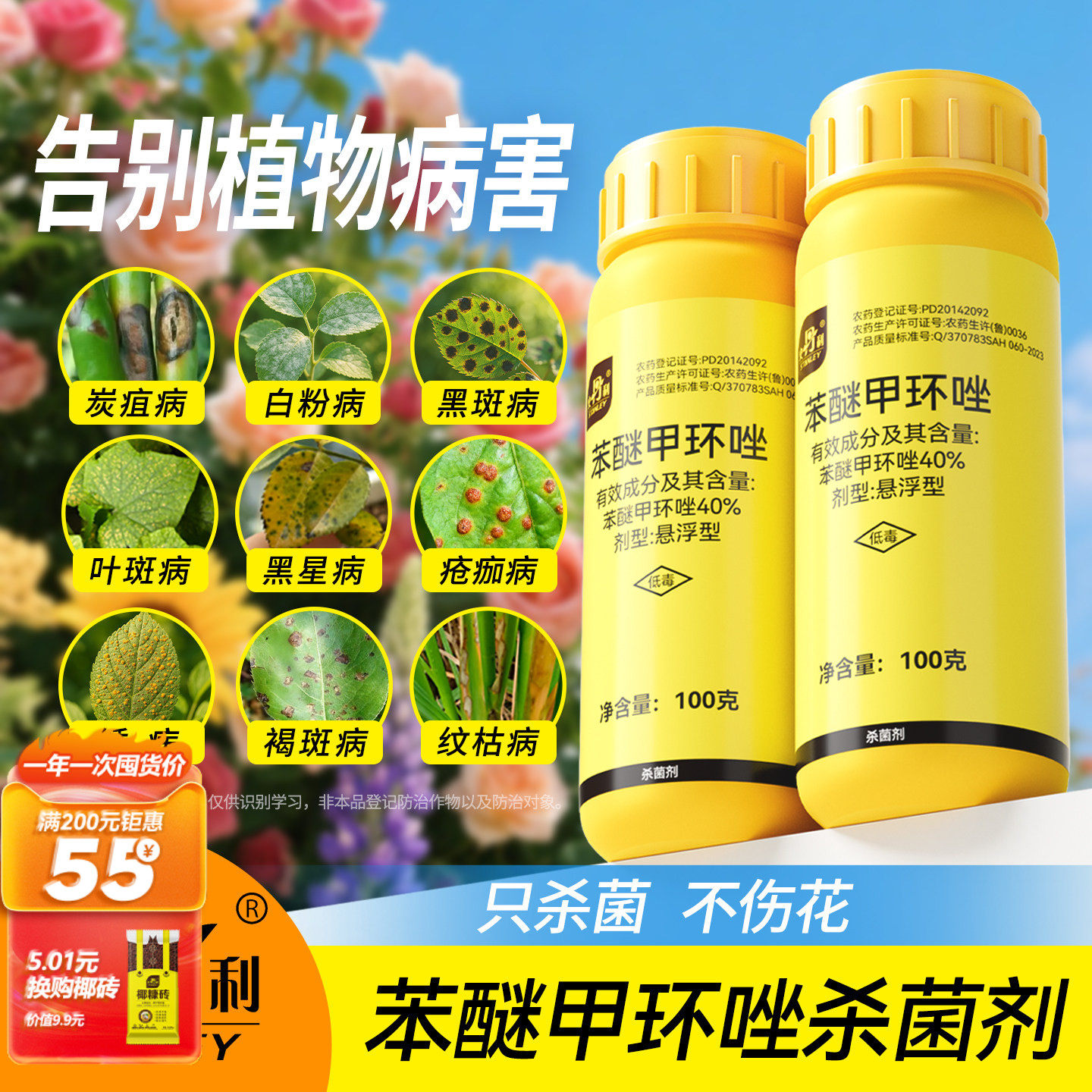 苯醚甲环唑杀菌剂炭疽病白粉病叶斑病霜霉病黑斑果树蔬菜花卉农药