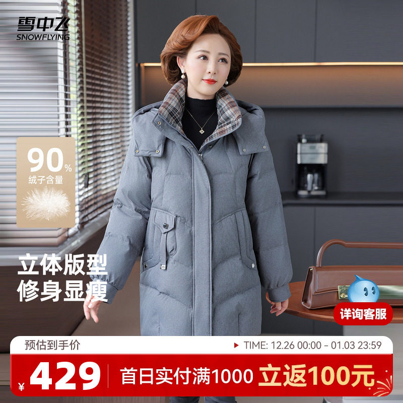 雪中飞妈妈中长款羽绒服女款2025新款中年女士连帽冬装中老年外套
