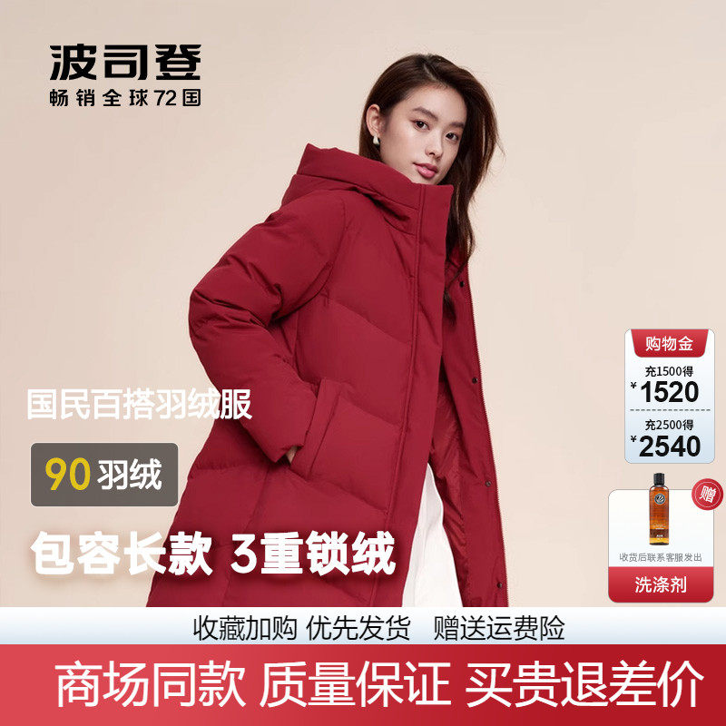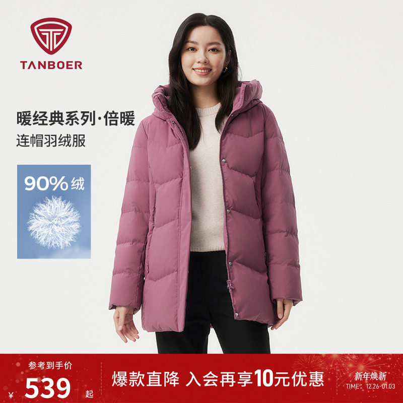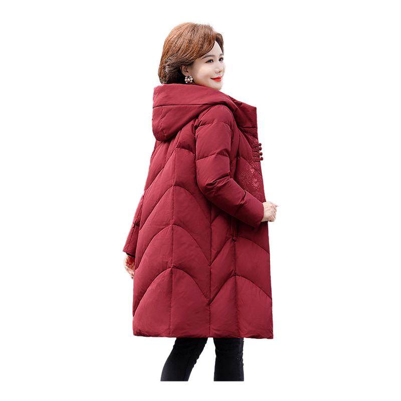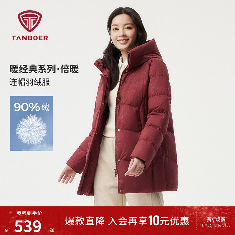 坦博尔冬季女士连帽中长款羽绒服中老年新年红送妈妈保暖加厚外套