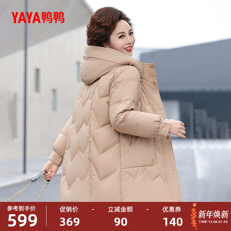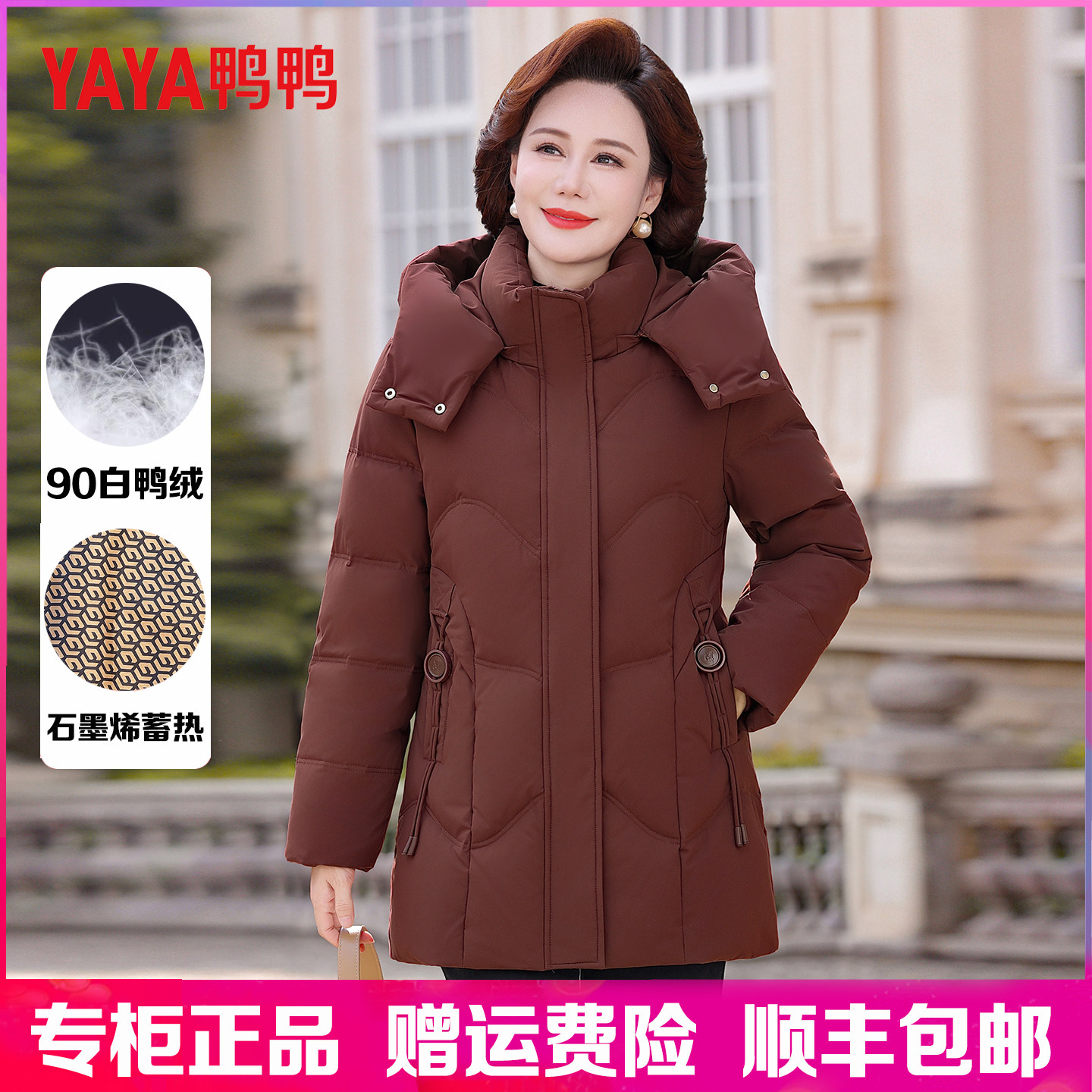 鸭鸭中老年羽绒服女2025新款冬季中长款连帽加厚保暖妈妈装外套A