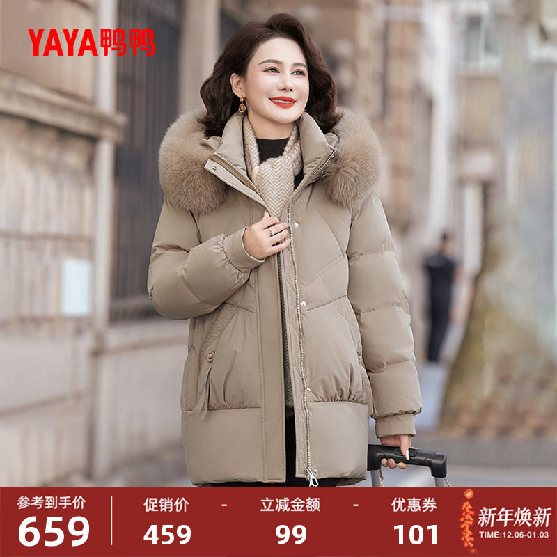 鸭鸭羽绒服中老年女款2025年妈妈装中长款狐狸毛领宽松保暖外套C