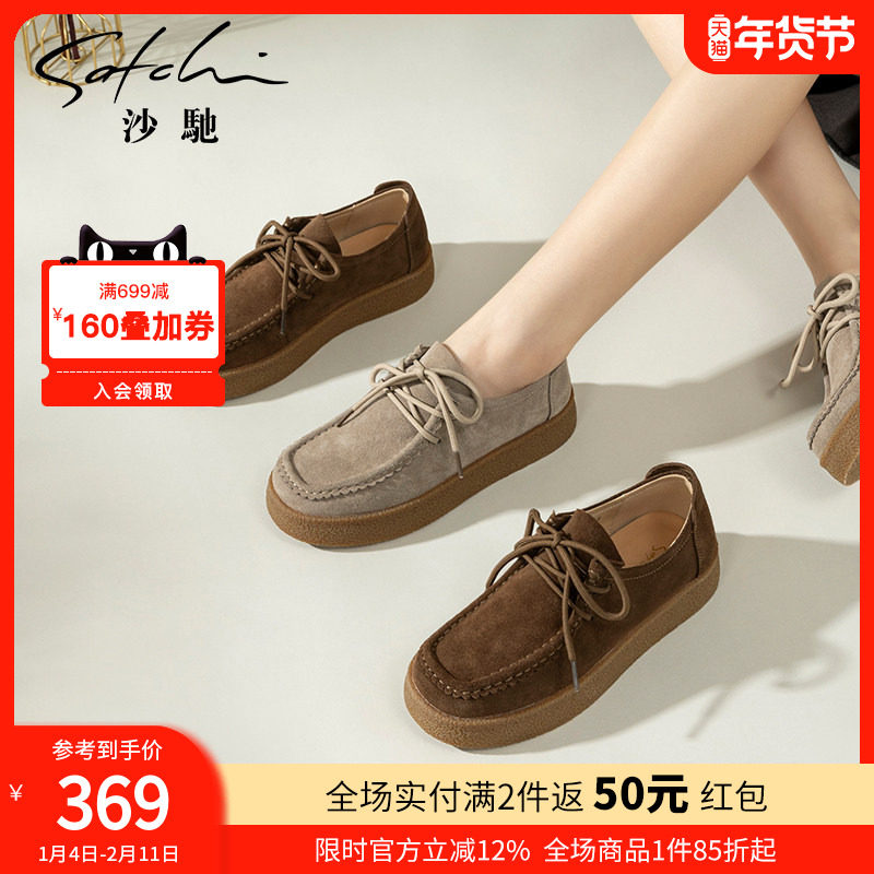 沙驰女鞋厚底平底真皮乐福鞋2025秋冬新款舒适绑带深口休闲单鞋潮