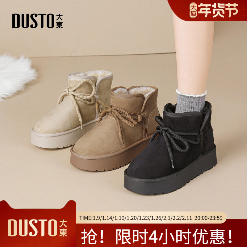 大东雪地靴女鞋2025年冬季新款舒适平底中跟套脚圆头绑带D0715