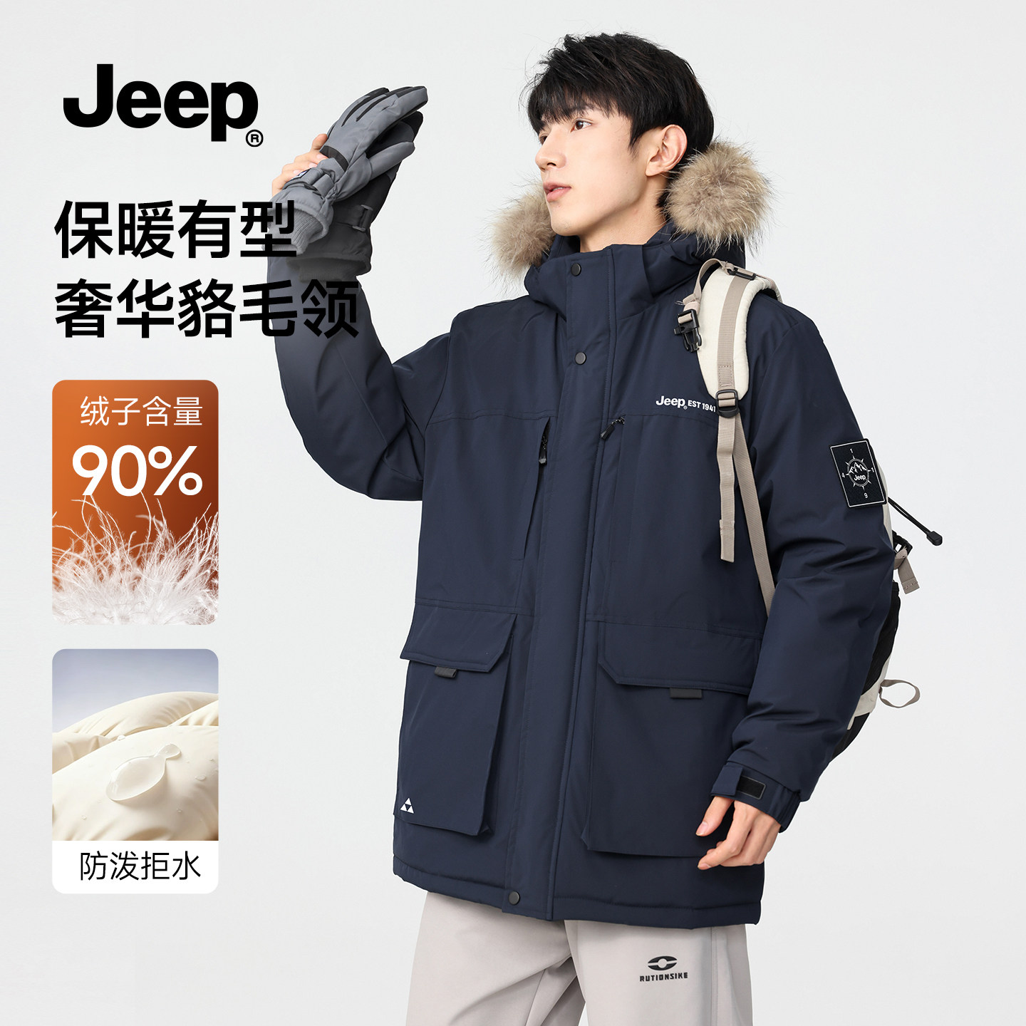 JEEP吉普中长款防风羽绒服男冬情侣户外保暖加厚毛领派克服外套女