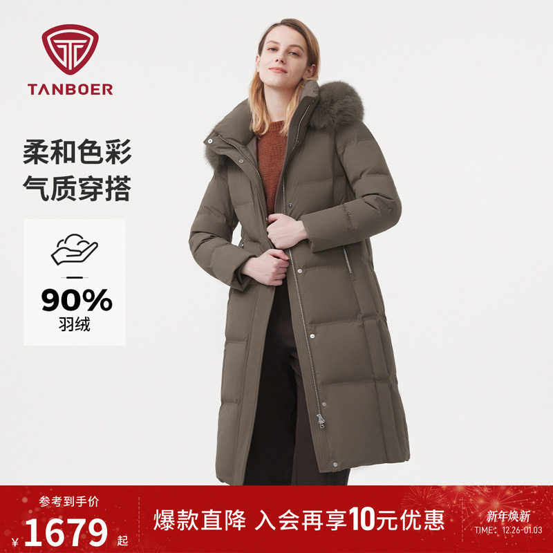 坦博尔羽绒服女中长款冬季过膝毛领连帽时尚加厚保暖高端冬装外套