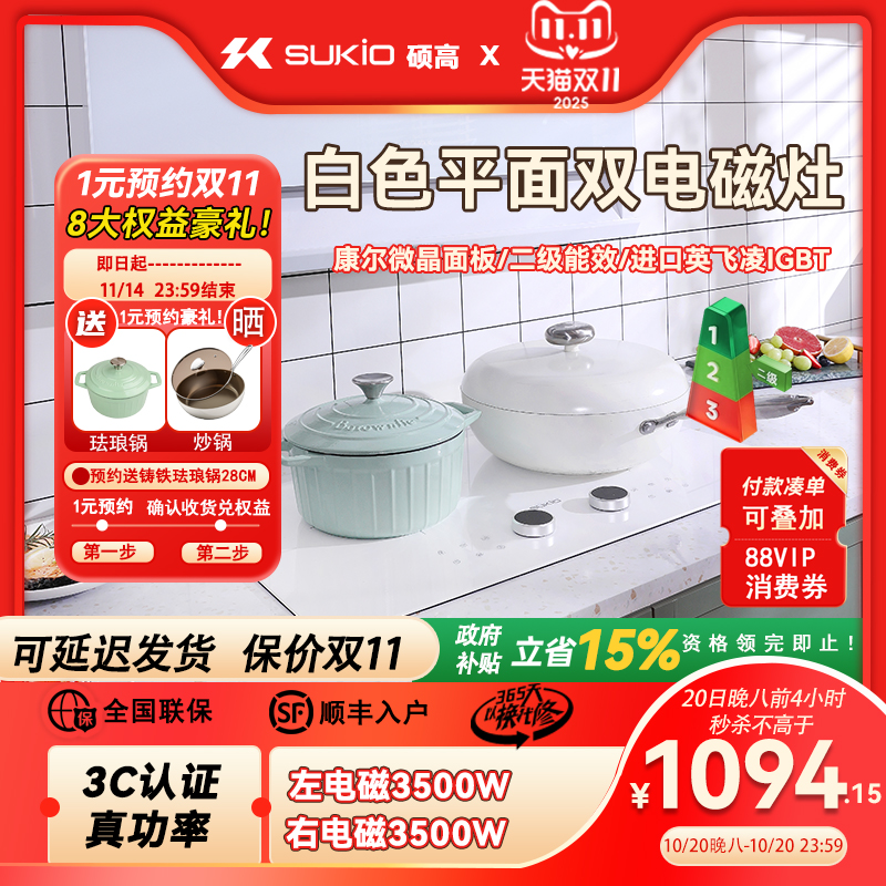 【二级能效】硕高白色电磁灶双炉高颜值嵌入式电磁炉爆炒家用电灶