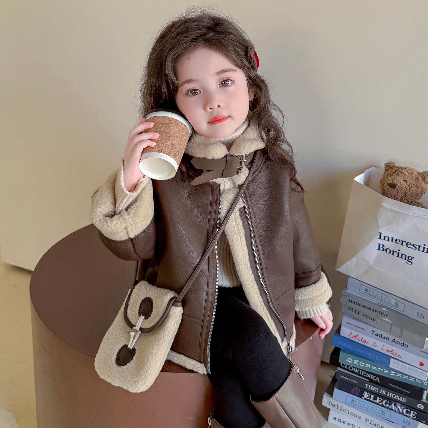 法国Uamtor女童洋气秋冬季加绒皮衣女宝宝2025新款加厚外套保暖潮