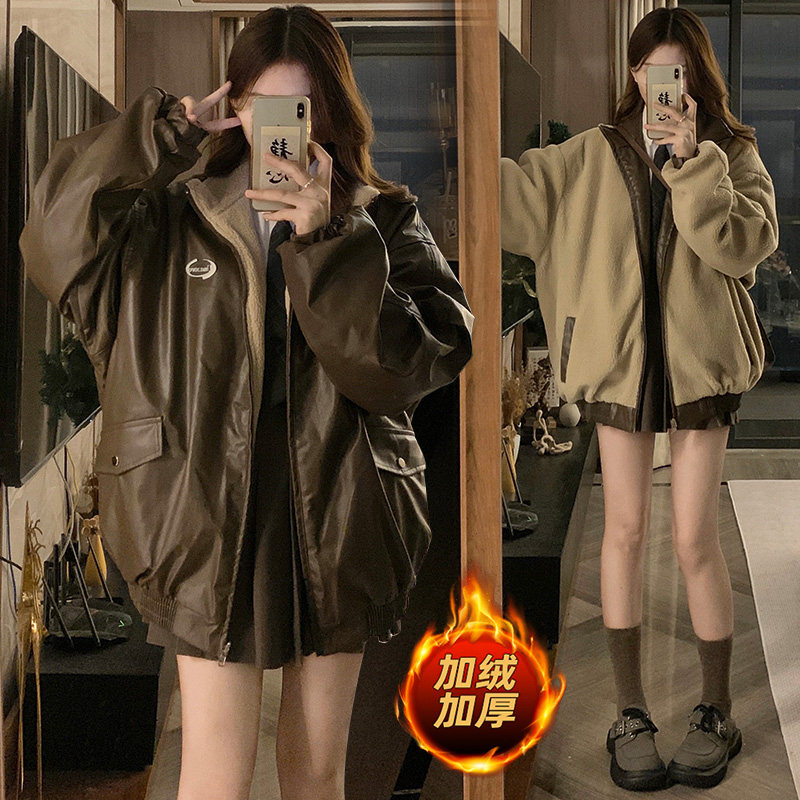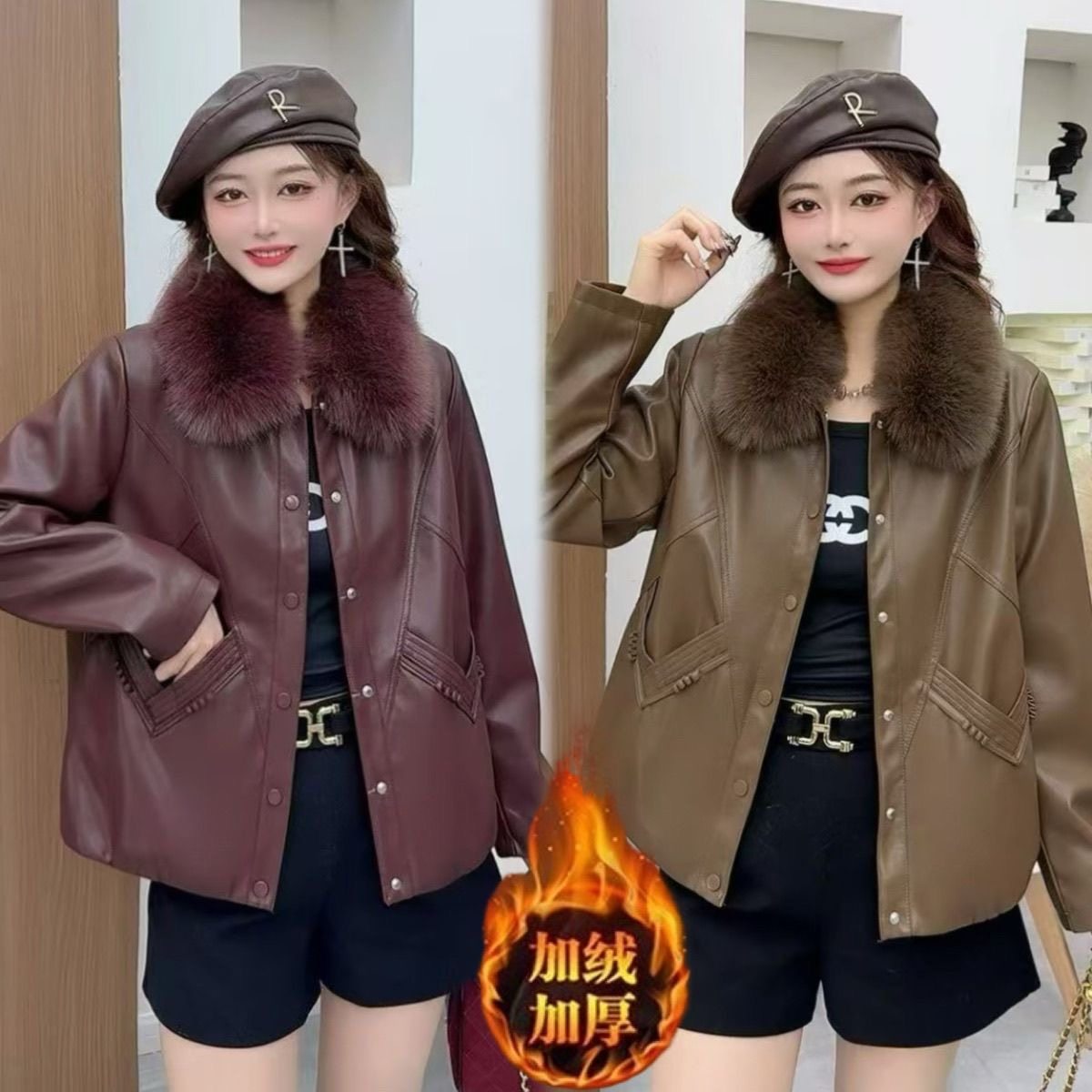 时尚减龄翻领加绒PU皮衣外套女2025秋冬新款宽松百搭外套上衣G603