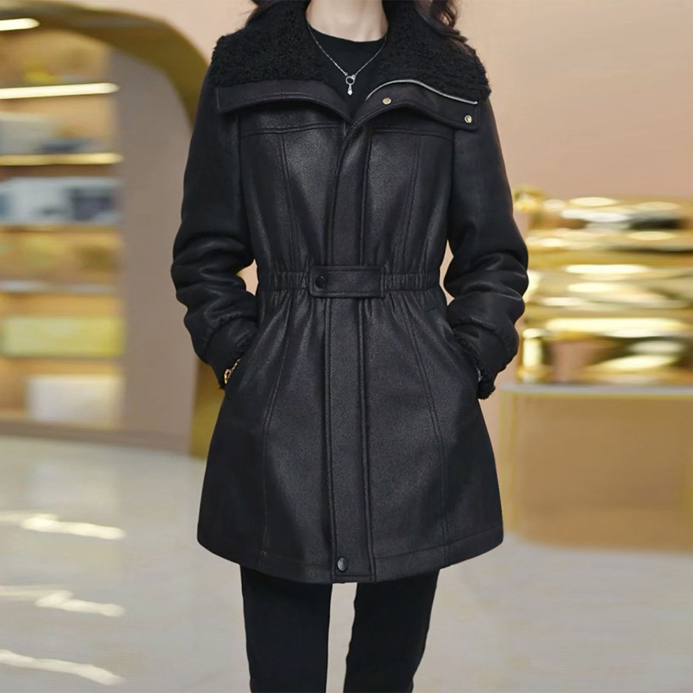时尚气质简约加绒皮衣女2025年冬季修身显瘦减龄遮肉百搭保暖外套