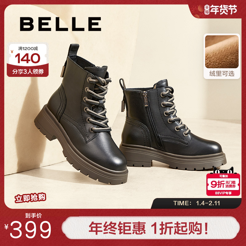 百丽女靴英伦风真皮马丁靴女保暖冬新时装靴厚底加绒短靴B9T1DDD4