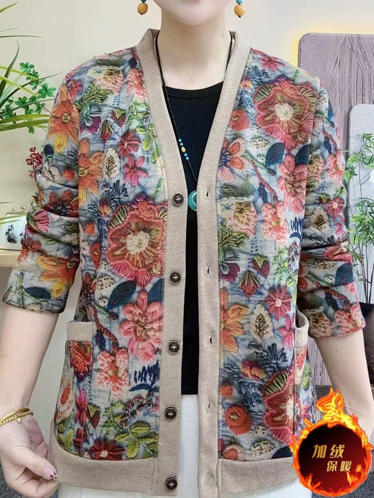 2024秋冬新款时尚花色加绒加厚时尚开衫Z大码显瘦保暖中老年外套