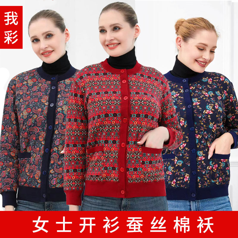 我彩2023桑蚕丝棉袄女开衫加厚保暖中老年外套妈妈奶奶装秋冬棉衣