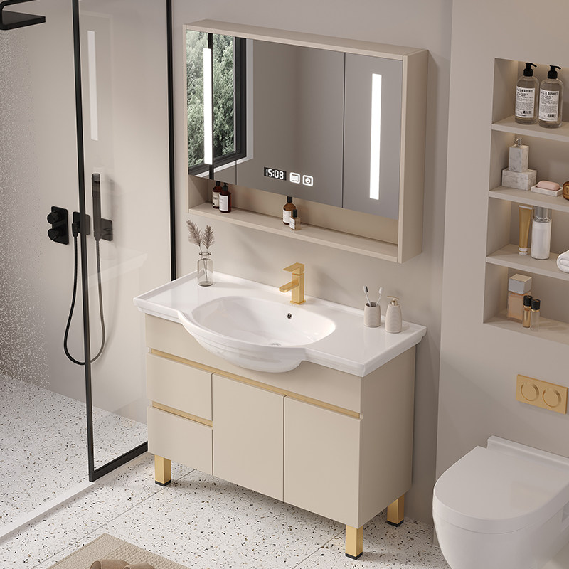 欧派陶瓷一体盆浴室柜组合奶油风卫生间落地式洗漱台洗手洗脸盆柜