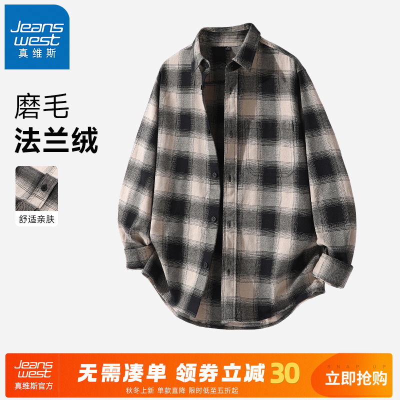 GV真维斯格子衬衫男春秋复古法兰绒长袖衬衣男士高级感休闲外套A