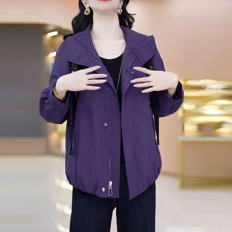 2025年韩版时尚连帽拉链设计春秋季女装中长款长袖纯色风衣外套潮