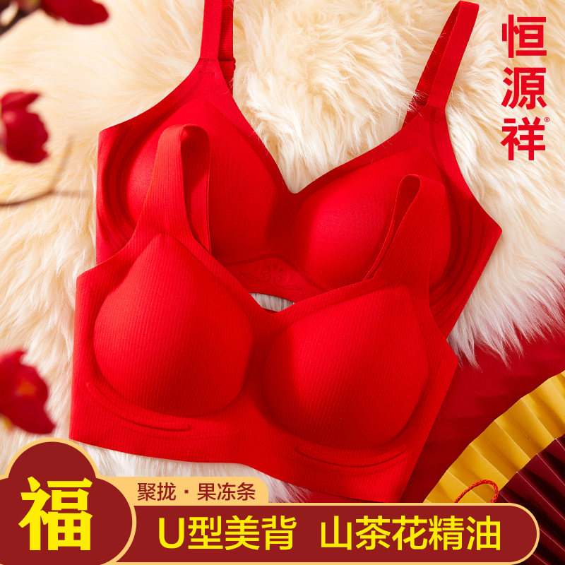 恒源祥本命年内衣套装女红色无痕小胸聚拢新娘结婚礼物无钢圈文胸