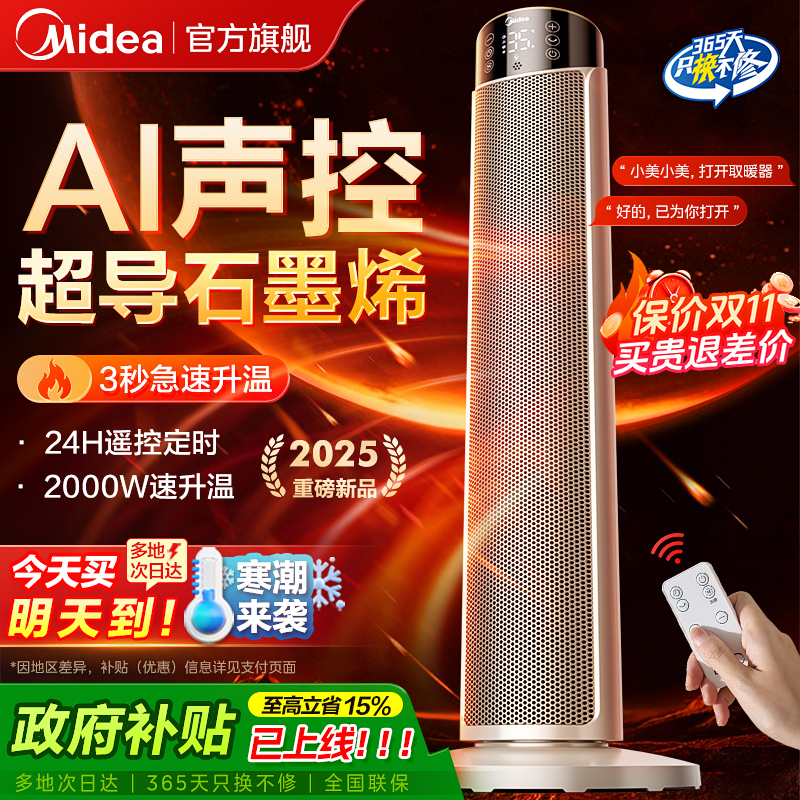 美的暖风机取暖器家用石墨烯电暖气炉节能小太阳2025新款神器冬季